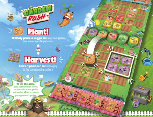 A 2-player, family-friendly game that takes about 5 minutes to learn and 40 minutes to play. Skillfully plant veggies in your garden and harvest them in specific patterns. Use tools to help your garden flourish or to create nuisances for your opponent. Be the fastest to harvest your veggies to win!