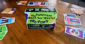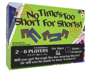 No Time’s Too Short For Shorts! ™ is an abstract ‘trick-taking-like card game where all of the action happens at once! Your aim is to wear shorts the most, each and every round. Every round you succeed at this, you win and get a point! Will you be the ‘shortiest’ player at the table? Or, will you be forced by the others to be down-trod and up-trowed? In this game, the shorter the leg-wear, the better! Who will you make wear the Trousers?
