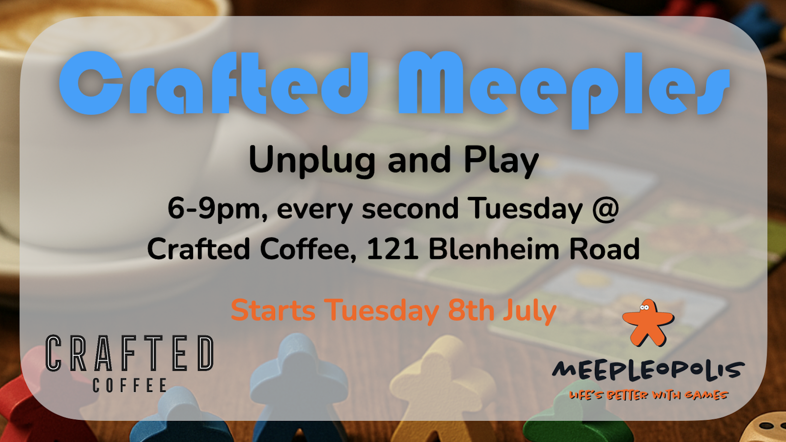 Crafted Coffee 121 Blenheim Road, Christchurch, Canterbury, New ZealandEvery second Tuesday, 6–9pm @ Crafted Coffee – 121 Blenheim Road. Step away from the screens and into a world of strategy, laughter, and face-to-face fun. Crafted Meeples is a fortnightly board game night brought to you by Meepleopolis and Crafted Coffee. Held as part of Crafted Coffee's No-Tech Tuesdays, these relaxed evenings are all […]