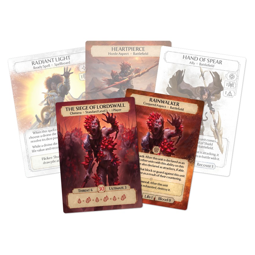 It began with war, the dead being unceremoniously dumped in an old mine. But the Red Rains flooded those tunnels, producing something horrifying. Now a veritable tide of human thralls surges toward Lordswall, their will controlled by the crimson crystals growing from their flesh. Choose from four returning Phoenixborn: Odette, Xander, Dimona, and James, each wielding a brand new signature card. Use the included new divine magic player deck to repel the enemy at the city’s gates! Hold the line, protect your comrades, then smite the wickedness of the crystalline plague. Stop the horde at Lordswall or brace for extinction!