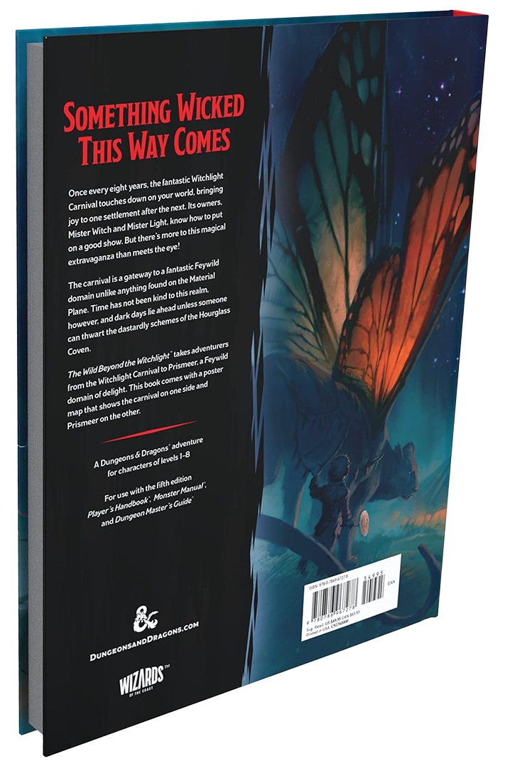 The Wild Beyond the Witchlight takes adventurers from the Witchlight Carnival to Prismeer, a Feywild domain of delight, and is designed for characters of levels 1–8. This book comes with a poster map that shows the carnival on one side and Prismeer on the other.