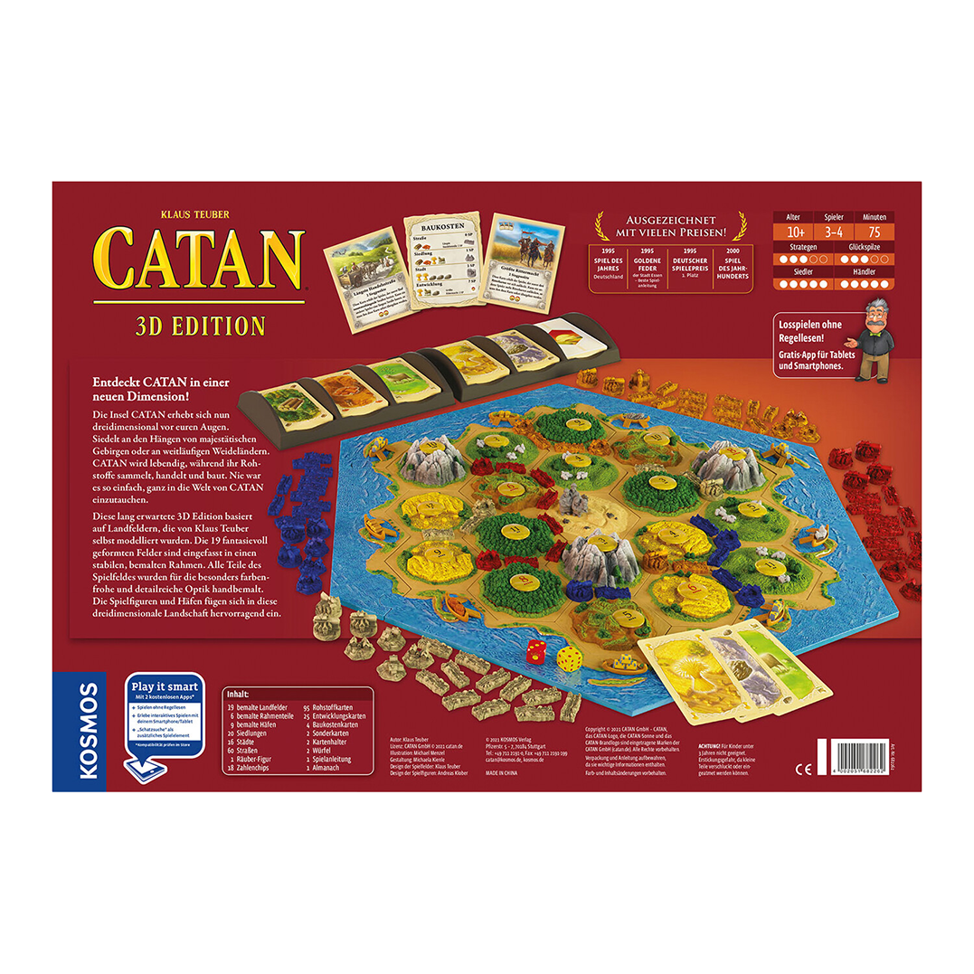In CATAN: 3D Edition, the island of Catan rises off the table for an immersive experience like no other. Your settlements grow from fertile grain fields, and your cities nestle into the sides of majestic mountains. The look of the land is based on terrain tiles hand-sculpted by game designer Klaus Teuber. All of the terrain is hand-painted for stunning color, and the intricately-designed player pieces are antiqued for a look that's full of history and character.