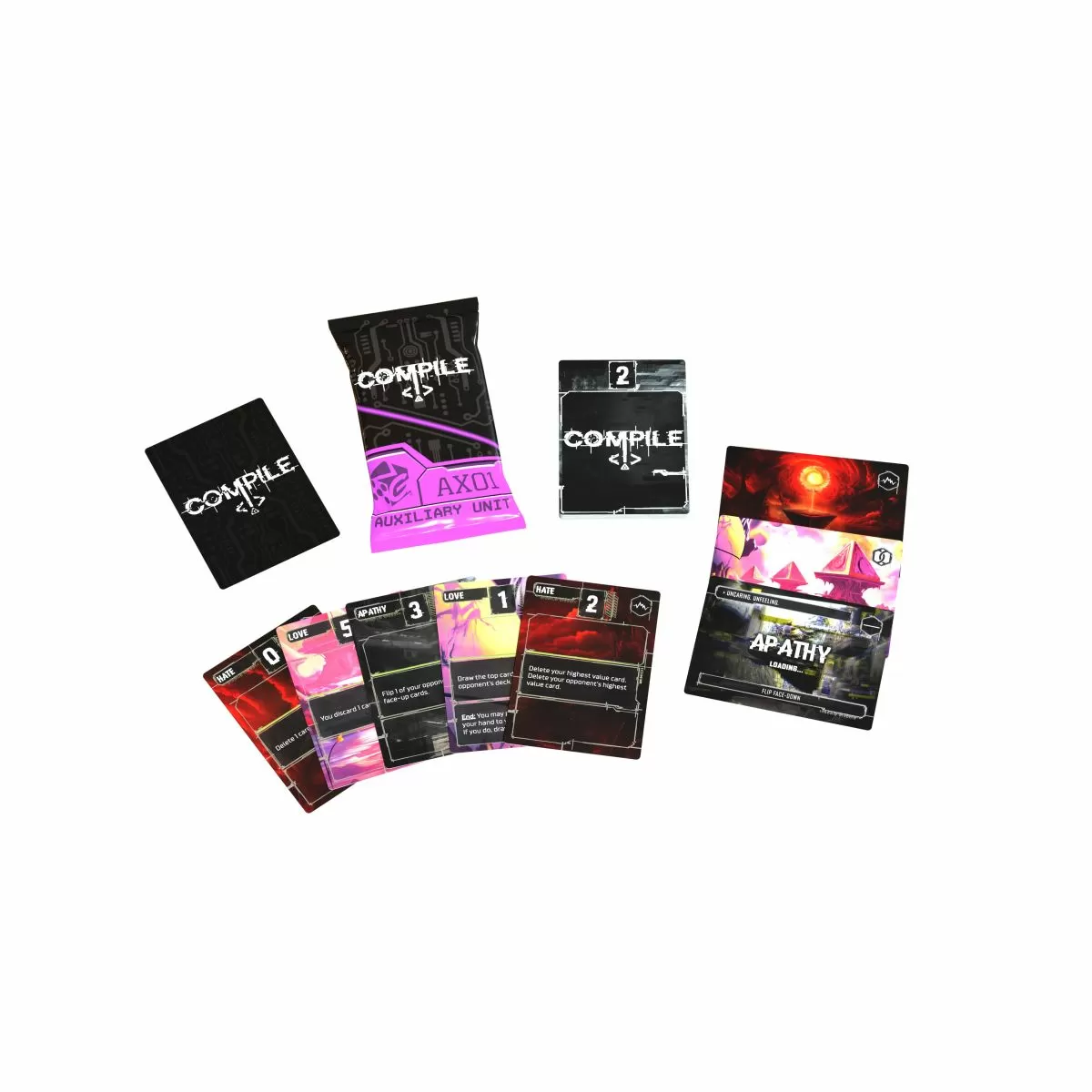 In the card game Compile, you are competing Artificial Intelligences trying to understand the world around you. Two players select three Protocols each to test. Concepts ranging from Darkness to Water are pitted against each other to reach ultimate understanding. Play cards into your Protocols' command lines to breach the threshold and defeat your opponent to Compile. But be careful! Moving and revealing cards have immediate action. You have to think like a computer, and think ahead, or you'll end up playing right into your opponent's hands. First to Compile all three Protocols grasps those concepts to win the game. Control your opponent's Protocols with card actions, Compile your own as fast as possible, and Compile your reality.