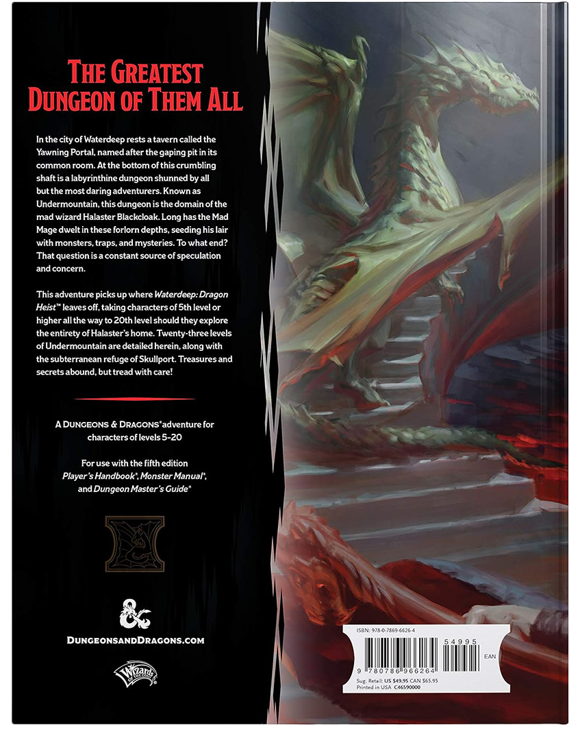 In the city of Waterdeep rests a tavern called the Yawning Portal, named after the gaping pit in its common room. At the bottom of this crumbling shaft is a labyrinthine dungeon shunned by all but the most daring adventurers. Known as Undermountain, this dungeon is the domain of the mad wizard Halaster Blackcloak. Long has the Mad Mage dwelt in these forlorn depths, seeding his lair with monsters, traps, and mysteries-to what end is a constant source of speculation and concern.