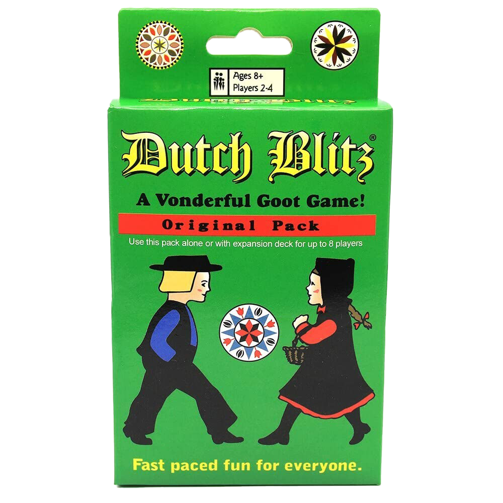 In Dutch Blitz, each player has her own deck of forty cards, with cards 1-10 in four colors; red and blue cards show a Pennsylvania Dutch boy, while yellow and green cards show a Pennsylvania Dutch girl. Each deck has a different symbol on the back to aid with card sorting between rounds.