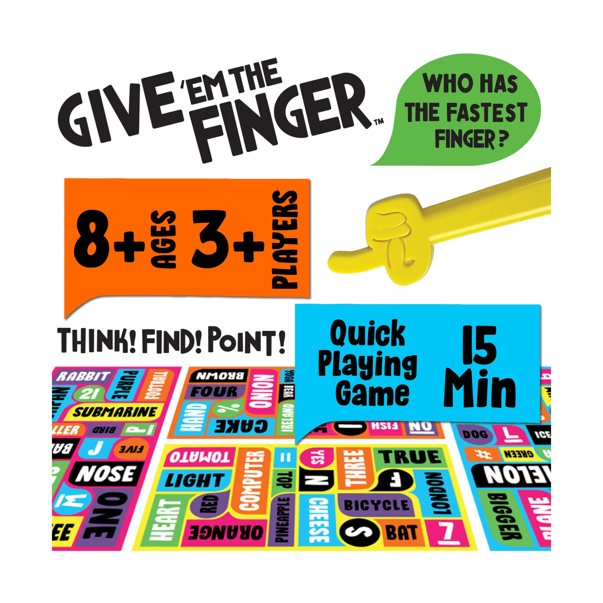 To play Give ‘Em The Finger, one player reads a question, then all players use their Finger Pointers to try to find the answer on the board in front of them. The first person to point to the answer wins the round. The first player to point to the correct answer and to shout wins the card. The first player to collect 6 cards wins the game!