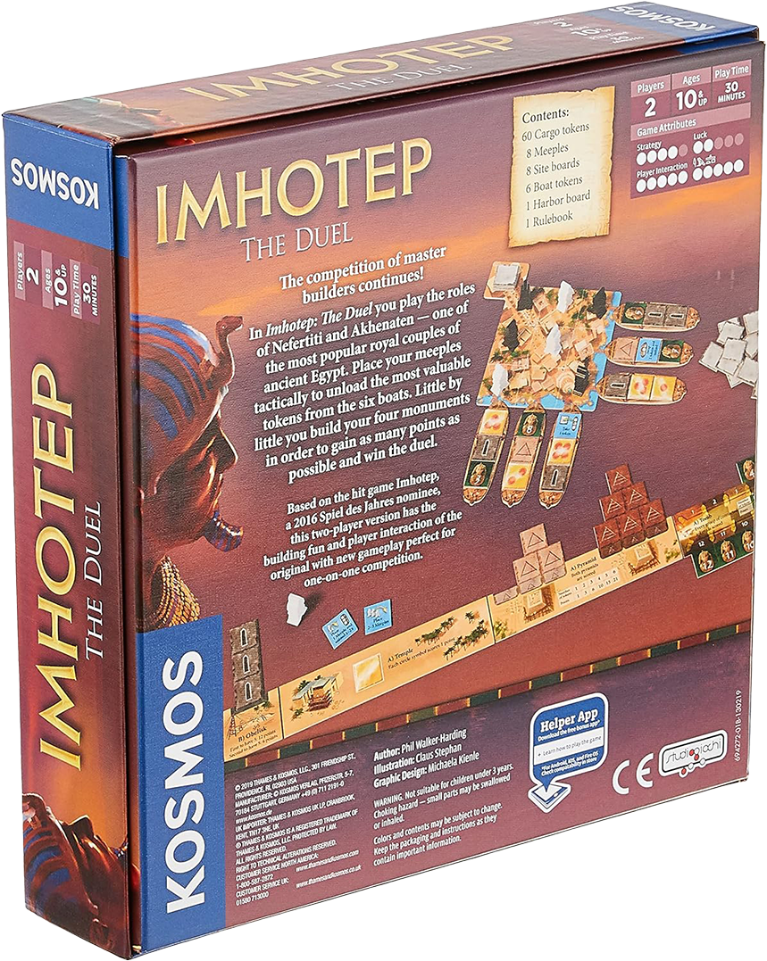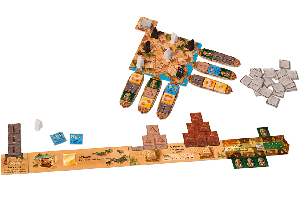 In this game, players take on the roles of Nefertiti and Akhenaten, one of Egypt's most famous royal couples. Game pieces must be cleverly placed so that players can unload the most valuable tiles from the six boats. While this is happening, each player builds their own four monuments in order to gain as many fame points as possible.