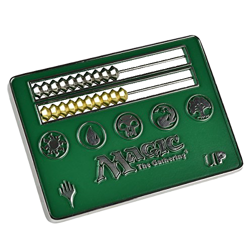 Quickly and easily count from 1 to 110 with the official Magic: The Gathering Abacus-style Life Counter. Made with a zinc alloy and finished with a matte green, the Magic Abacus Life Counter features all five Mana Symbols. Size approximately 88mm x 63mm and fits inside any Ultra PRO Deck Box. The top row of beads are finished in silver while the bottom row is finished in gold for better visual distinction.