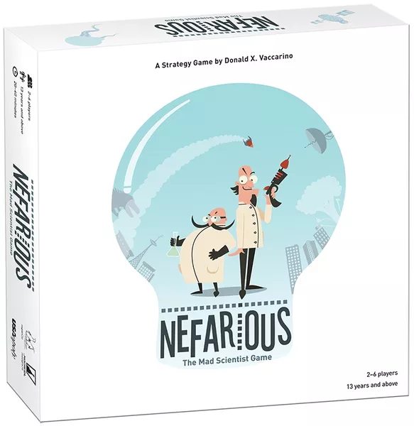 Nefarious is a quick-playing game in which the players race to build inventions like a freeze ray, cloaking device, or robotic pet before their opponents can do the same. (Interesting side note: Eighteen different artists contributed to the artwork on the different inventions in the game.)