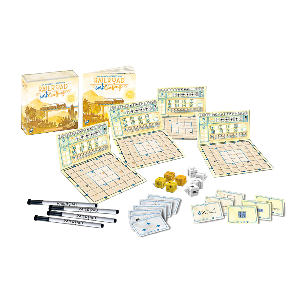 Railroad Ink Challenge is a quick-playing roll-and-write game for 1 to 4 players. Grab a board and a dry-erase marker, and get ready to reach networking nirvana! Roll the dice and draw the routes to connect the exits around your board. Expand your network with railways, highways and stations to collect points, but you will be penalized for any open connections, so plan carefully!