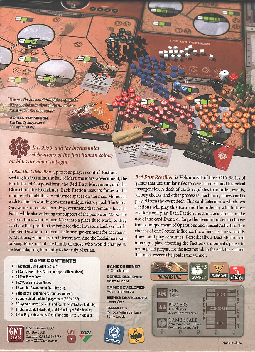 Red Dust Rebellion is volume XII of GMT's acclaimed COIN Series, and tells the story of the Martian revolts of the 2250s and the rise of Martian nationalism.