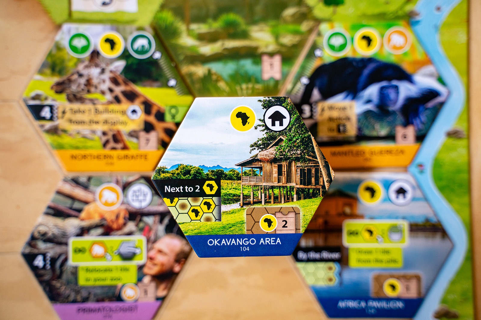 Each player has a set of four action cards to manage their gameplay, and the power of an action is determined by the slot the card currently occupies. One of those cards will let you play projects, and the other three cards will let you play animals of a specific habitat: forest, rock, or water.