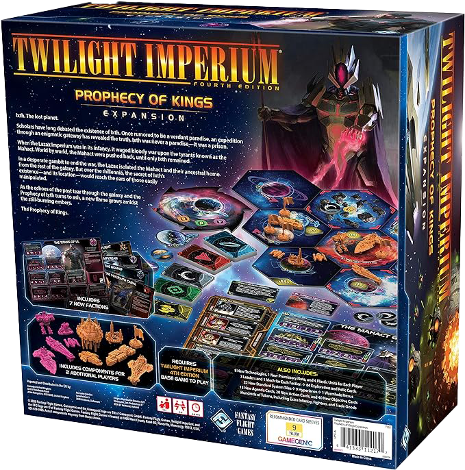 The Prophecy of Kings expansion is packed with new content for Twilight Imperium (Fourth Edition). The galaxy has grown far larger as seven never-before-seen factions enter the game, each boasting its own unique strengths and weaknesses, from the gene-altering powers of the Mahact to the watchful guard of the Argent Flight, to the mysterious and ancient Empyrean. And new factions aren't the only way the galaxy grows bigger! Forty new system and hyperlane tiles add new planets and obstacles to the map, and with two new colors of player components included in the box, you can play Twilight Imperium with up to eight players.