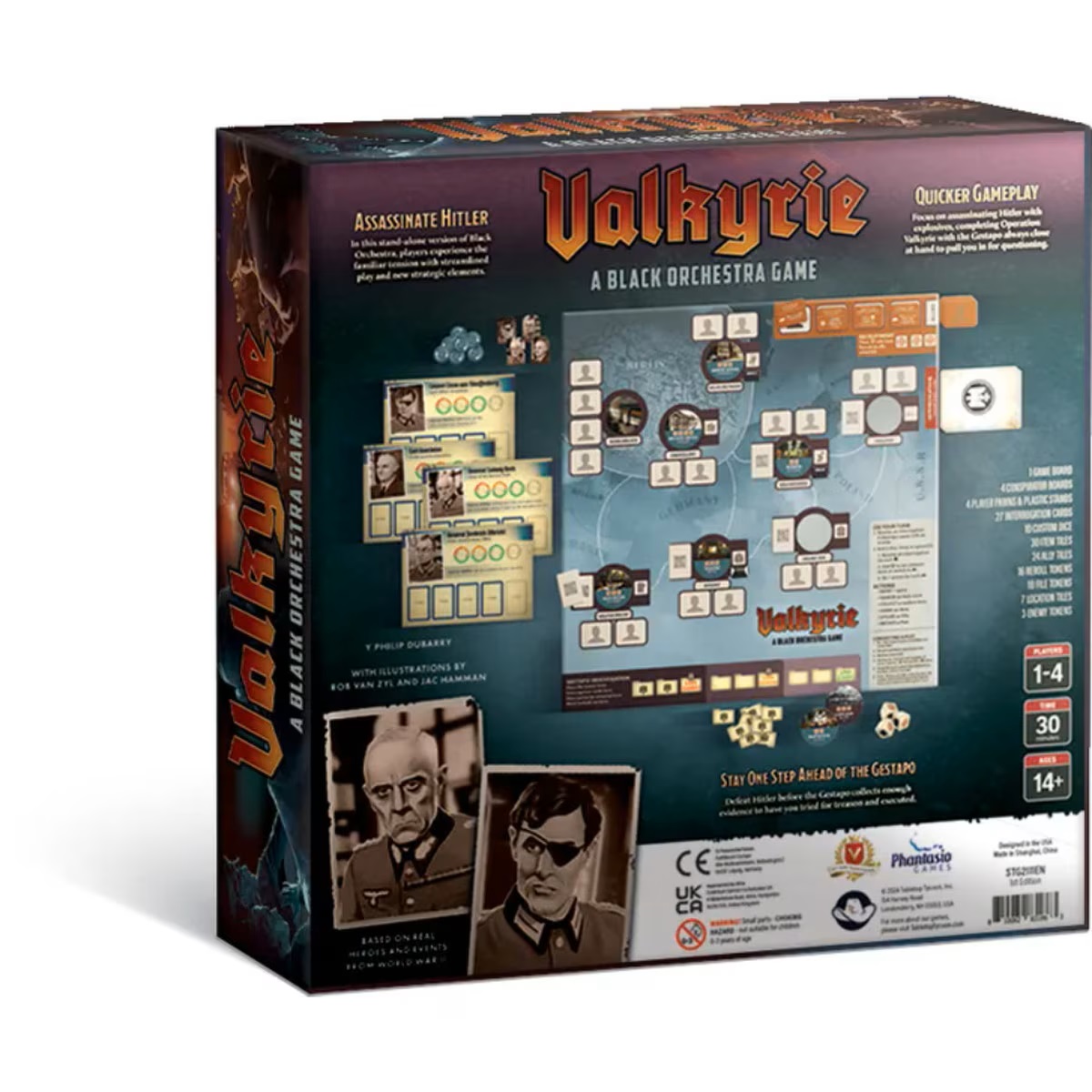 Valkyrie is a Black Orchestra game with quicker, simpler gameplay, and new strategic elements. Focus on assassinating Hitler with explosives, completing Operation Valkyrie with the Gestapo always close at hand to pull you in for questioning. Stay one step ahead of the Gestapo and defeat Hitler before they collect enough evidence to have you tried for treason and executed.