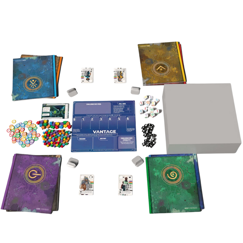 Vantage is not a campaign game. Each game is a standalone experience; you bring to future sessions only what you’ve learned about the world. It is completely self-contained with no expansions — just a few accessories like metal coins.